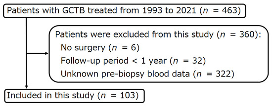Of the 463 patients with GCTB treated at the authors’ institutions between January 1993 and December 2021, 6 patients who did not undergo surgery, 32 patients with a postoperative follow-up of fewer than 12 months, and 322 patients with unknown pre-biopsy blood data were excluded. The remaining 103 patients were included in this retrospective study (Figure 1).