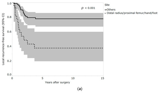 On univariate analysis, patients with GCTB of the distal radius/proximal femur/hand/foot presented a higher risk for local recurrence compared with patients who had GCTB at another site (hazard ratio (HR) = 4.16; 95% confidence interval (CI), 2.01–8.59; p < 0.001; Table 2) (Figure 2a).