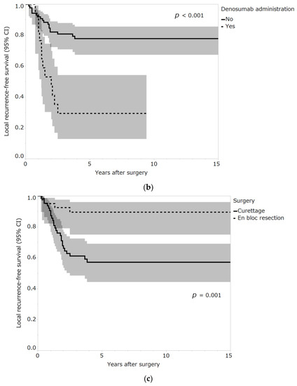 (a) Local recurrence—free survival rates of patients by tumor site. Shading around the curves represents the 95% confidence interval (CI). (b) Local recurrence—free survival rates of patients by denosumab administration. Shading around the curves represents the 95% CI. (c) Local recurrence—free survival rates of patients by the surgical method. Shading around the curves represents the 95% CI.