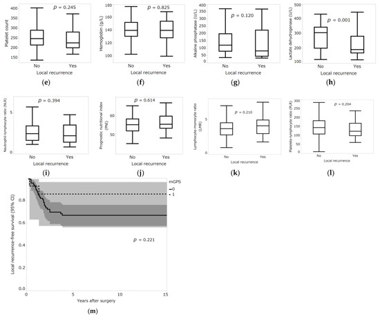 (a) Mann-Whitney U test comparing C-reactive protein with and without local recurrence. (b) Mann-Whitney U test comparing neutrophil count (×109/L) with and without local recurrence. (c) Mann-Whitney U test comparing lymphocyte count (×109/L) with and without local recurrence. (d) Mann-Whitney U test comparing monocyte count (×109/L) with and without local recurrence. (e) Mann-Whitney U test comparing platelet count (×109/L) with and without local recurrence. (f) Mann-Whitney U test comparing hemoglobin with and without local recurrence. (g) Mann-Whitney U test comparing alkaline phosphatase with and without local recurrence. (h) Mann-Whitney U test comparing lactate dehydrogenase with and without local recurrence. (i) Mann-Whitney U test comparing neutrophil-lymphocyte ratio (NLR) with and without local recurrence. (j) Mann-Whitney U test comparing prognostic nutritional index (PNI) with and without local recurrence. (k) Mann-Whitney U test comparing lymphocyte-monocyte ratio (LMR) with and without local recurrence. (l) Mann-Whitney U test comparing platelet–lymphocyte ratio (PLR) with and without local recurrence. (m) Local recurrence-free survival rates of patients by modified Glasgow prognostic score (mGPS). Shading around the curves represents the 95% confidence intervals (CIs).