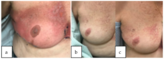 Patient with acute dermatitis grade 3 during radiation treatment (a) subsequently developed worsening telangiectasia at 1 year and 2 year follow-up (b,c). Course 1: mammosite balloon brachytherapy to 34 Gy and course 2: WBRT to 46.8 Gy in 26 daily fractions with 14 Gy lumpectomy cavity boost.