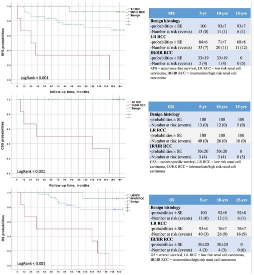 While local recurrences were uncommon (n = 1; 1.5%), 12 patients (19%) were diagnosed with metachronous tumors in the ipsi- or contralateral kidney and 10 (16%) developed distant metastases during the study period. The risk of metastatic spread was significantly higher in IR/HR RCC (log rank p < 0.001; Figure 2). Fifteen-year DFS, CSS and OS probabilities were 68 ± 6%, 90 ± 4% and 72 ± 6%, respectively, and varied according to histology and MCRSS/UCISS risk groups (all p < 0.001) (Figure 3).