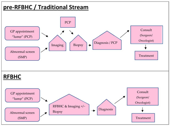 Diagnostic pathways. Pre-RFBHC patients were diagnosed with breast cancer prior to the establishment of the RFBHC (i.e., 1 January 2015 to 30 May 2017). RFBHC and Traditional Stream patients were diagnosed 30 May 2017 to 30 April 2019.