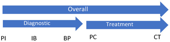 Study primary endpoints: Overall (presentation to initial treatment), Diagnostic (presentation to pathology), Treatment (pathology to initial treatment). Study secondary endpoints: PI (presentation to imaging); IB (imaging to biopsy); BP (biopsy to pathology); PC (pathology to specialist consult); and CT (consult to initial treatment).