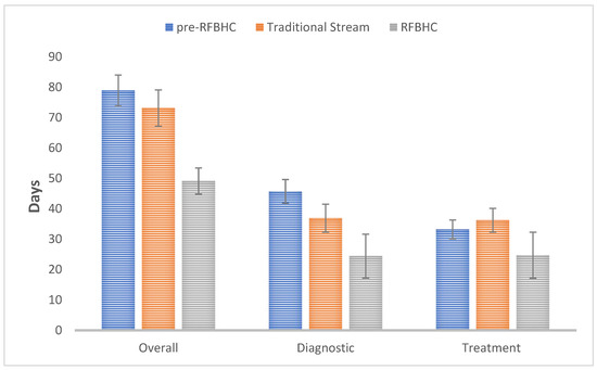 - Compared to the pre-RFBHC group, the RFBHC group had a 29.8 days shorter mean overall wait time (49.1 vs. 78.9 days, p ≤ 0.001), 21.3 days shorter mean diagnostic wait time (24.4 vs. 45.7 days, p ≤ 0.001), and 8.5 days shorter mean treatment wait time (24.7 vs. 33.2 days, p = 0.037).