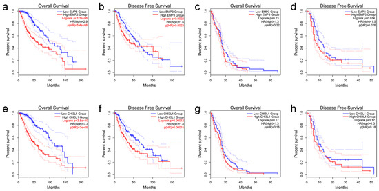OS and DFS analyses based on EMP3 and CHI3L1 expression in LGG (a,b,e,f) and GBM (c,d,g,h) using the TCGA database.