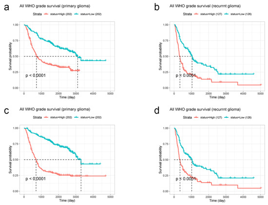 We selected 404 primary glioma patients and 253 recurrent glioma patients from the CGGA database, including all glioma types. Similarly, EMP3 and CHI3L1 were classified according to their median expression levels. A survival curve was drawn according to the survival time, and the median survival was statistically analyzed. Survival curves showed that in primary and recurrent gliomas, the survival time of patients with low levels of EMP3 was superior to that of patients with high levels of EMP3, with p < 0.001 (Figure 3a,b). The survival curve of CHI3L1 was similar to that of EMP3 (Figure 3c,d).
