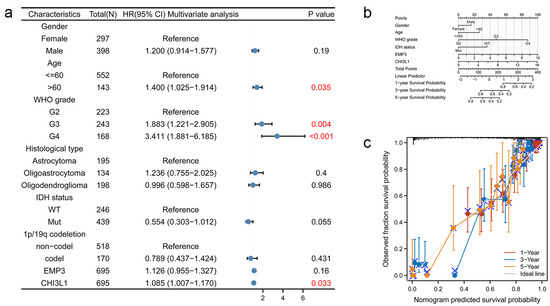 Nomogram development and validation. (a) For OS, hazard ratios and p-value of constituents involved in multivariate Cox regression considering clinical information and prognostic EMP3 and CHI3L1 in TCGA database. The numbers in red represent p < 0.05; (b) the Nomogram graph of the Cox survival curve regression analysis model; (c) Nomogram calibration curve for Nomogram OS prognostic model.