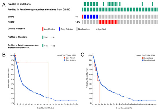 Genetic alteration of EMP3 and CHI3L1 (A) and the association with OS in gliomas (B,C).
