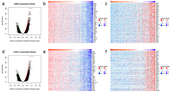 Co-expression genes and heat map of EMP3 (a–c) and CHI3L1 (d–f) in glioma cells.