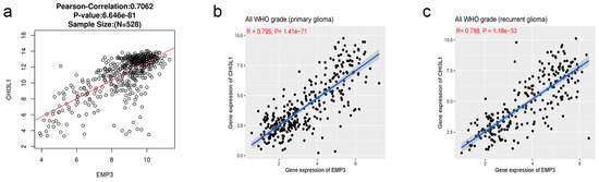 To further verify the correlation between EMP3 and CHI3L1 in patients with glioma, we analyzed the correlation between these two proteins in patients with primary and recurrent gliomas. The results showed that EMP3 positively correlated with CHI3L1 in both primary and recurrent gliomas (Figure 7b,c).