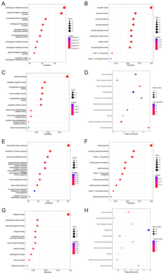We performed a GO analysis and a KEGG analysis for EMP3 and CHI3L1, respectively. The GO analysis showed that the biological process (BP) of EMP3 was mainly related to the metabolism of aminoglycan metabolic process and glycosaminoglycan metabolic processes (Figure 8A); and the cellular components (CCs) were concentrated primarily in the vacuolar lumen and lysosomal lumen (Figure 8B). The molecular function (MF) of EMP3 was significantly enriched in protease binding (Figure 8C). The KEGG enrichment analysis showed that EMP3 was significantly correlated with viral myocarditis and leishmaniasis (Figure 8D). The BP of CHI3L1 was mainly related to acute inflammatory response and immune response activation (Figure 8E). The CCs were primarily concentrated in the tertiary granule and secretory granule membrane (Figure 8F), and the MF was enriched in collagen binding (Figure 8G). The KEGG enrichment analysis revealed a significant relationship between CHI3L1 and phagosomes (Figure 8H).