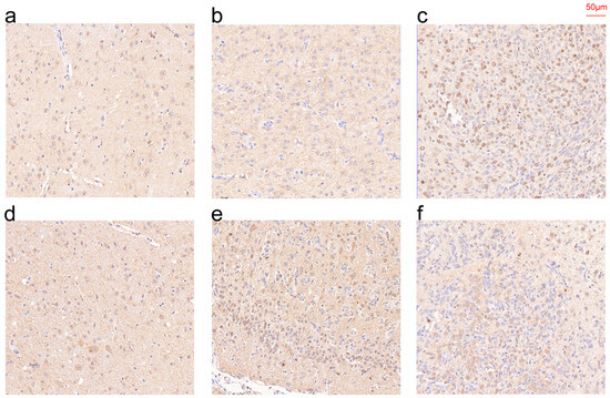 IHC of CHI3L1 (a–c) and EMP3 (d–f) in normal tissue (a,d), LGG (b,e), and GBM (c,f).