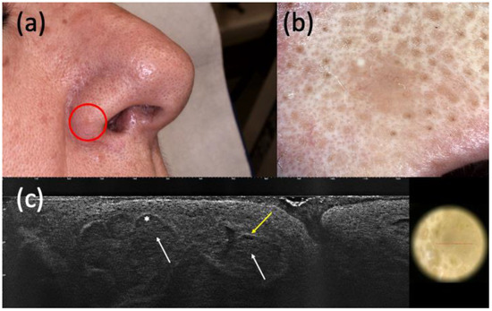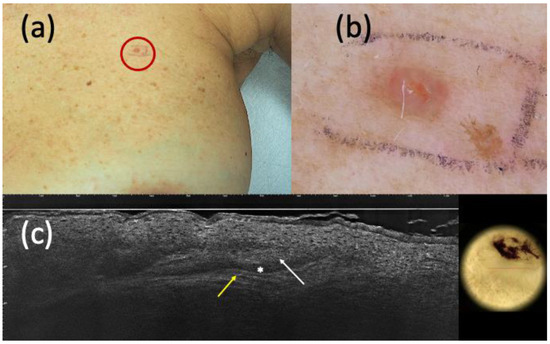 Histologically diagnosed nodular basal cell carcinoma (BCC) with non-specific clinical (a) and dermoscopic (b) examination but highly suspected in line-field confocal optical coherence tomography (LC-OCT) (c). It was a small pink papule on the right nasal ala (a) that showed a homogeneous pinkish pigmentation with some short fine telangiectasias (b) in dermoscopy. The presence of hypo-reflective roundish lobules (white arrows), clefting (white asterisk), and hyperreflective stroma (yellow arrow) in LC-OCT supported the hypothesis of BCC.