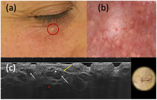 Nodular basal cell carcinoma (BCC) on histopathology, with non-specific clinical (a) and dermoscopic (b) examination but highly suspected in line-field confocal optical coherence tomography (LC-OCT) (c). It was a small whitish papule of the right inferior palpebra (a) that, under dermoscopy, displayed a homogeneous white pigmentation and branched vessels (b). The presence of hypo-reflective roundish lobules (white arrows), clefting (white asterisk), hyperreflective stroma (yellow arrow), and highly hypo-reflective areas corresponding to dilated vessels (red asterisk) in LC-OCT corroborated the hypothesis of BCC.