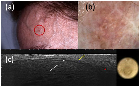 Suspected basal cell carcinoma (BCC) under clinical examination (a), dermoscopy (b), and line-field confocal optical coherence tomography (LC-OCT) (c). It was a dyschromic macule of the left frontotemporal region (a) that, in dermoscopy, showed shiny white streaks and short fine telangiectasias (b). In LC-OCT, hypo-reflective roundish lobules (white arrow), clefting (white asterisk), hyperreflective stroma (yellow arrow), and highly hypo-reflective areas corresponding to dilated vessels (red asterisk) were observed (c). However, the histologic examination revealed the existence of a trichoblastoma.