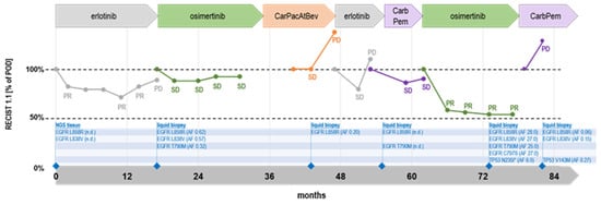 Therapy was subsequently switched to third-line osimertinib in February 2018 in line with clinical practice at the time. From June 2018 to May 2019, partial remission of the primary lung lesion was achieved with osimertinib. However, in parallel, newly arising osseous metastases required radiation of different anatomical sites, including the os ilium, femur, and shoulder. Starting in May 2019, tumor progress was observed in the left hilus and cerebrally. According to the results of the IMpower150 trial, atezolizumab/bevacizumab/paclitaxel/carboplatin were administered in July 2019 but resulted in stable disease for almost a year. In May 2020, a progressive disease was diagnosed regarding the primary and ulnar metastases. A liquid biopsy was taken and analyzed by NGS, and since only the L858R mutation was detectable but no resistance mutation (i.e., T790M), the patient was rechallenged with erlotinib, resulting in a moderate remission of the primary lesion and the pulmonary metastases until January 2021, when progressive disease at multiple sites was diagnosed and another liquid biopsy was taken. This time, due to poor ctDNA concentration, ctDNA analysis was conducted by cobas® EGFR Mutation Test v2, and T790M was found in addition to the L858R. Due to the patient’s wishes she subsequently received carboplatin and pemetrexed as sixth-line treatment, followed by pemetrexed maintenance therapy leading to disease stabilization. However, kidney values worsened, leading to a rechallenge with osimertinib. In December 2021, significant partial remission was achieved that lasted about one year and was superseded by progressive disease. A liquid biopsy showed relatively high allele frequencies of the previously detected EGFR L858R (AF 27%), T790M (AF 25%), and L838V (AF 27%). Additionally, an EGFR C797S (AF 27%) was present and a pathogenic TP53 point mutation N234I* (AF 6%). EGFR C797S is one of the most common modes of resistance to osimertinib treatment []. CtDNA was also mutated in TP53, showing a likely inactivating, pathogenic TP53 mutation N235I* that leads to a premature translational stop. TP53 mutations are not regarded as classical resistance mutations. The TP53 mutation was not detected at the primary diagnosis or later on during the course of therapy. Since the allelic frequency of TP53 N234I* (AF 6%) was low compared to the EGFR mutations found in the same liquid biopsy (AF 25–27%), it may indicate subclonal differentiation. Since both resistance mutations, EGFR T790M and C797S, occurred in cis (located on the same allele), TKI combination therapy was not regarded as expedient, and therefore carboplatin and pemetrexed were administered up to the time of the preparation of this manuscript. The latest liquid biopsy analysis (April 2023) revealed low allele frequencies of L858R (AF 0.06%), L838V (AF 0.15%), the absence of T790M and C797S, and again a new TP53 variant V143M (AF 0.27), that was previously undetectable. At the same time, RECIST showed progressive disease under carboplatin/pemetrexed. Up to date (July 2023), the patient is treated with docetaxel and ramucirumab. Clinical and therapeutic follow-up as well as molecular diagnosis are summarized together with responses by RECIST in Figure 1.