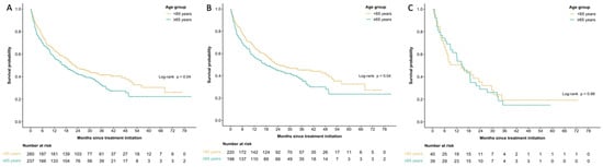 In the entire cohort (n = 497), survival was shorter in the older cohort with median OS at 17.1 months (95% CI 12.3–22.9 months) in patients ≥65 years old and 22.2 months (95% CI 18.7–33.8 months) in patients <65 years, p = 0.04 (Figure 1A). The survival difference was driven by the cutaneous melanoma cohort where median OS was 18.2 months (95% CI 12.3–30.4 months) in patients ≥65 years old and 23.8 months (95% CI 19.2–48.2 months in patients <65 years old, p = 0.04 (Figure 1B). No significant differences were seen in the non-cutaneous melanoma cohort, with median OS at 14.9 months (95% CI 10.0–23.7 months) in patients ≥65 years old and 14.4 months (95% CI 6.9–29.6 months) in patients < 65 years old (p = 0.88) (Figure 1C).