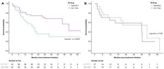 Age < 65 years, normal LDH, dNLR < 3, ECOG performance status < 2, stage M1a/1b, combination ipilimumab plus nivolumab, and first-line immunotherapy were significantly associated with improved OS in univariate analysis (Supplemental Table S2). However, age was not independently associated with OS (p = 0.59), and the combination of ipilimumab plus nivolumab showed a trend of independent association (p = 0.07) in multivariate analysis. Normal LDH, dNLR ≤3, ECOG performance status <2, stage M1a/1b, and first-line IO remained independently associated with OS (Supplemental Table S2).