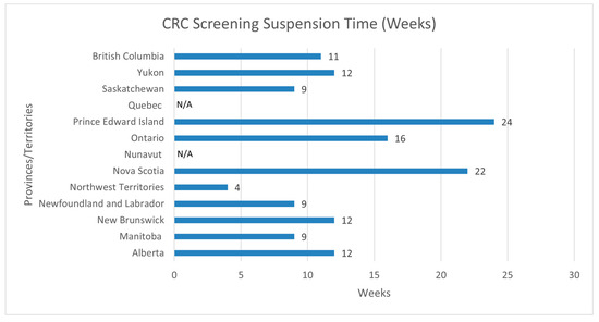 Eleven of the thirteen jurisdictions (85%) reported interruptions in their CRC screening services, including fecal immunochemical testing (FIT) procedures and the subsequent diagnostic colonoscopies (Figure 1). Quebec and Nunavut, two jurisdictions with no established CRC screening programs at the time of this article, but who are in the process of implementing a program, reported reductions in screening for those who did not see their healthcare practitioner during the first wave of the COVID-19 pandemic. The duration of interruptions varied per jurisdiction, as PEI reported the longest period of suspension (24 weeks), while the Northwest Territories reported the shortest suspension period (4 weeks). CRC screening services were suspended for an average of 13 weeks across the eleven provinces that reported suspensions, while the most common was 12 weeks—as three out of the thirteen jurisdictions reported suspending services for 12 weeks (AB, NB, YT).