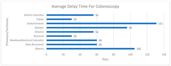 Average delay time (in days) for colonoscopies (due to positive FIT) in different provinces/territories.