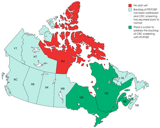 Most screening programs were interrupted, and there was approximately a 30% decrease in new patient referrals in Saskatchewan, Ontario, and Quebec, and 50–75% of treatments continued by using virtual tools such as phone calls [10]. In Quebec, by way of example, there was a reduced performance of screening initiatives due to both low participant turnout in FIT programs and inconsistent referrals of patients who tested positive for the FIT and subsequent diagnostic colonoscopies [11]. The cancellation of scheduled colonoscopy appointments and higher rescheduling rates further disrupted screening programs, with many Quebec residents cancelling their appointments due to the fear of COVID-19 [12]. Importantly, these reductions were not unique to Quebec alone, as other provinces across Canada and countries in Europe experienced similar patterns of CRC screening interruptions [12].