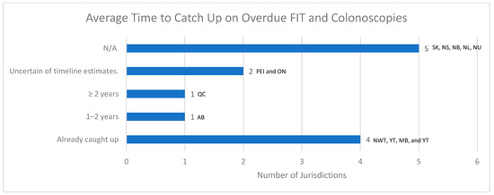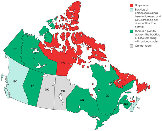 The representatives were requested to provide an approximate number of missed CRC screenings (this includes reduced volume) or year-over-year changes. All jurisdictions (100%) reported a decrease in the number of screenings performed. Newfoundland and Labrador reported 4000 fewer FITs between March 2020 and March 2022. Alberta reported a decrease in both FIT (293,000 to 207,000) and colonoscopies (113,200 to 87,500) between 2019 and 2020—representing a 30% decrease for FIT and 25% for colonoscopies. In Ontario, for the average risk CRC patients, the volume of FIT declined by 4.4% in March 2020 and it declined by 78.3% in April, 90.3% in May, and 91.3% in June; however, afterward, the volume began to recover as FIT kit mailing resumed [8]. Furthermore, in Ontario, the range (33.2–52.8%) of colonoscopies performed was lower from February to April 2020, with the lowest month being March 2020 (9.2–12.8%) [8]. Quebec reported 166,000 fewer FIT analyses (647,000 to 481,000) and 60,000 fewer colonoscopies (267,000 to 207,000) between April 2020 and March 2021—representing a 26% decrease for FIT and 22% decrease for colonoscopies.