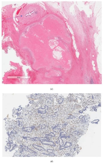 Pathology from tumour sites, as listed, (a) Sigmoid colon, biopsy. Invasive, well-differentiated adenocarcinoma. H&E, (b) Irregular mucin pools with a fibroinflammatory reaction, and no residual neoplastic cells were identified. H&E, (c) Left ureter (arrow) and mass. This mass likely represents a previously positive lymph node that has been entirely replaced with foamy histiocytes and fibrosis. No residual tumour was identified. H&E, (d) MLH1 = loss of nuclear expression. There is intact nuclear expression within background nonneoplastic tissue, (e) Mass 1 = proximal ascending colon, which is likely the site of the previous tumor. There is an area of submucosal and intramuscular fibrosis with associated lymphohistiocytic inflammation. The area is surrounded by large, reactive lymphoid aggregates (not pictured). There is no evidence of dysplasia or residual tumor, (f) Mass 2 = sigmoid colon, which is likely the site of the previous tumor. There is an area of fibrosis with chronic xanthogranulomatous inflammation. There are associated occasional acellular mucin pools (not pictured). No residual viable tumor or evidence of dysplasia is present.