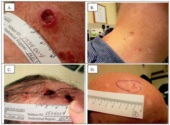 Treatment response in patient 2 (of >20 lesions). Panel (A): Neck lesion pretreatment. Panel (B) Neck lesion after 2 years of therapy. Note scar remodeling. Panel (C): Scalp lesions prior to treatment. Panel (D): Scalp lesions after 2 years of therapy. Note development of global alopecia.