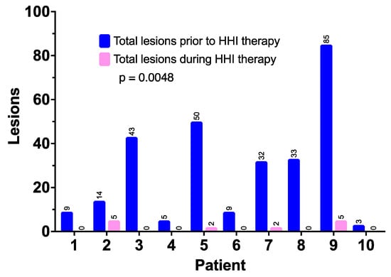 HHI treatment also resulted in a significant reduction in new BCCs in all patients when compared to the pretreatment (shown in Figure 3). The number of BCCs per patient prior to the HHI treatment was a mean of 28.3 (range of 3–85 documented BCCs), whereas the mean number of new BCCs during treatment (with median potential follow-up of over 30 months) was 1.4 (range of 0–5) (p = 0.0048).