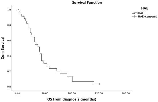 - Sex: 68% (n = 23) of the patients were female. The female patients had higher OS compared to male patients (23.67 vs. 16.91 months); however, this difference was not statistically significant (p = 0.47).