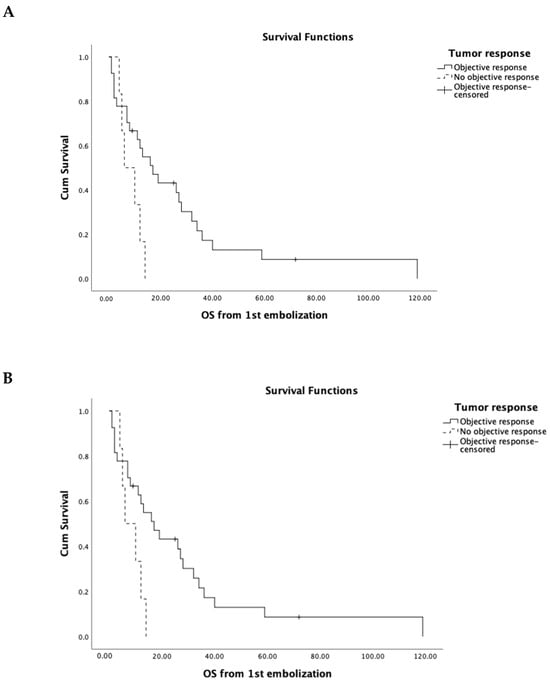 - Indication for embolization: Patients that were treated as the first line of treatment (n = 10) had higher OS compared to chemorefractory patients (28.5 vs. 17 months). However, this difference was not statistically significant.