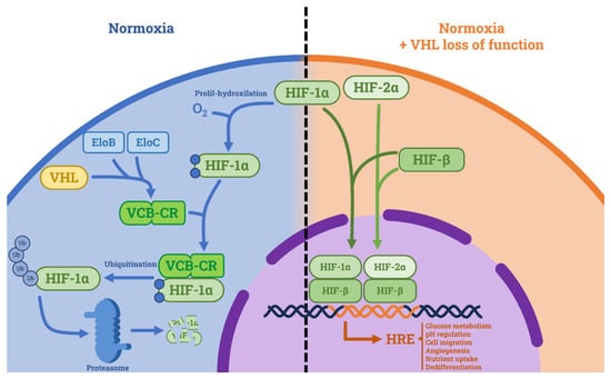 Tumor suppressive role of VHL and consequences of its loss of function. In normoxic conditions, VHL forms a complex with Elongin C and Elongin B (namely VCB-CR) and induces proteasome-mediated HIF degradation. In hypoxic conditions and in VHL loss of function, HIF is not degraded. HIF-1α and HIF-2α form complexes with HIF-β and translocate in the nucleus where they activate the hypoxia-related elements (HREs), which cause tumorigenic effects. Abbreviations: HIF: hypoxia inducible factor, HRE: hypoxia-related element, EloB: Elongin B, EloC: Elongin C, VCB-CR: VHL-Elongin C-Elongin B-Cullin 2-Ring Box 1 complex.