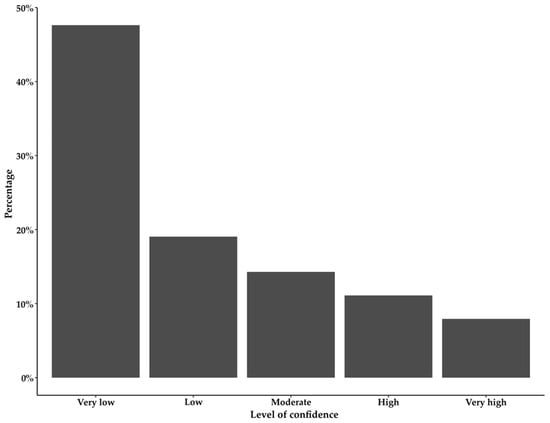 In general, the men had low scores on the domains regarding orgasmic function and intercourse satisfaction, where half of the men had a median score of 0 and 1, respectively. However, the median score of the sexual satisfaction domain was 5; see Table 2. Self-perceived confidence (Q15) in obtaining an erection was rated as very low by 30 of 62 patients, accounting for 48% (Figure 2).