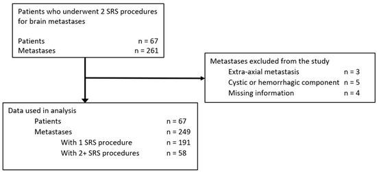 Sixty-seven patients underwent two SRS procedures for the relapse of a previously treated metastasis or for progression of a different untreated metastasis. Fifty-eight metastases were treated twice with SRS.