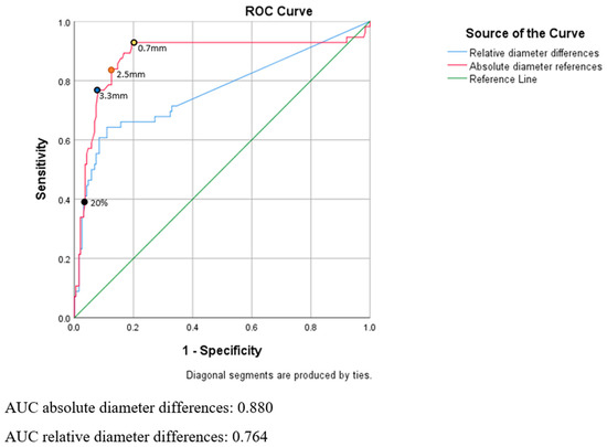 The ROC curve of the stratified RANO-BM criteria is illustrated in Figure 3. The blue curve represents the changes in sensitivity and sensibility caused by relative percentage increases between metastases diameter at different times during follow-up, such as the 20% increase in diameter in the original RANO-BM definition shown by the black point on Figure 3. The red curve represents the changes in sensitivity and sensibility caused by absolute increases in metastases diameter at different times during follow-up. The use of absolute increases as thresholds for stratified RANO-BM criteria instead of relative percentage increases achieves better test efficiency, with better global sensitivity and specificity in our series. The Area Under Curve corresponding to the ROC curve of absolute increases in metastases diameter is 0.880, compared to the ROC curve of relative increases in metastases diameter, with an Area Under Curve of 0.764.