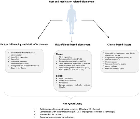 Host and medication-related biomarkers that can impact the immune checkpoint blockers’ (ICI) response.