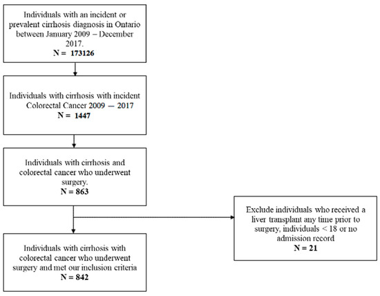 Individuals with incident or prevalent cirrhosis were identified using a previously validated algorithm [20]. The algorithm included a combination of physician visits and hospital diagnosis codes. Within this group, those with an incident diagnosis of colorectal cancer from 2009 to 2017 in the Ontario Cancer Registry (OCR) who underwent surgery were included. The OCR contains a near-complete capture of incident colorectal cancers, with >95% being microscopically confirmed [21,22]. Surgery was identified using physician billing codes from the OHIP physician claims database (Table S2). We excluded individuals with the following criteria: diagnosis of cirrhosis after diagnosis of colorectal cancer; did not have a valid identifier; were not linkable to other ICES datasets; underwent liver transplantation prior to surgery; no corresponding hospital record for their surgical admission; and under 18 years of age at the time of surgery.