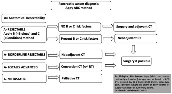 Treatment algorithm for PDAC patients using “ABC method” (A—anatomical resectabi- lity, B—biological resectability and C—clinical conditions). All PDAC patients should initiate systemic treatment apart from anatomically resectable PDAC without high-risk biological factors (absence of B factors) and fitness for surgery (absence of C factor), as demonstrated in the figure. In all cases, there are no rigid cut-offs for any high-risk aggressive features; therefore, these are left as considerations for the treating oncologists/surgeons. Note that before any systemic chemotherapy, biopsy for histological characterization is mandatory. High-risk biological features include suspicious hepatic or pulmonary lesions, the presence of positive lymph nodes (histologically proven or based on positivity of PET-FDG scan), large pancreatic primary tumors with dimension superior to 2–3 cm, elevated baseline level tumor biomarker CA 19-9 and several clinical characteristics such as celiac-type pain or significant weight loss (≥10% of body weight).