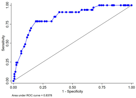 The logistic regression analyses for the prediction of postoperative AKI are displayed in Table 2. In the multivariable analysis, female sex (odds ratio [OR] 0.34, 95% confidence interval [CI] 0.13–0.92, p = 0.033), zero ischemia (OR 0.10, 95% CI 0.01–0.84, p = 0.035), warm ischemia ≤17 min (OR 0.10, 95% CI 0.03–0.37, p < 0.001), and SAC time ≤29 min (OR 0.12, 95% CI 0.30–0.47, p = 0.002) were independently associated with the occurrence of postoperative AKI. The R.E.N.A.L. nephrometry score could not retain significance (OR 1.33, 95% CI 0.97–1.83, p = 0.08). The multivariable model provided high accuracy with an 84% AUC-ROC (Figure 1). Based on this model, we generated a preoperative nomogram to calculate the individual probability of postoperative AKI according to the foreseen ischemia type (Figure 2). Decision curve analysis showed a clinical net benefit of 0.12 at the threshold probability of 20% by applying this model (Figure 3).