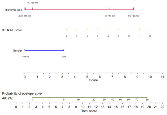 Univariable and multivariable binary logistic regression analyses were performed to investigate predictors for postoperative AKI. We created a multivariable model for the risk of postoperative AKI by including the extrapolated ischemia types of interest and all significant parameters from the univariable analysis. We calculated the receiver operating characteristic–area under the curve (ROC-AUC) to evaluate the model’s performance accuracy. The clinical net benefit of the model was assessed by decision curve analysis, which can be interpreted as a comparison between the proposed model and the model without ischemia types, giving the percentage of patients saved from AKI after RAPN within a certain threshold probability. Based on the proposed model, we generated a nomogram ready for clinical use to predict the probability of postoperative AKI.