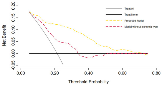 Decision curve analysis demonstrating the clinical net benefit of the proposed multivariable model versus the model without inclusion of ischemia type. Clinical net benefit has an immediate clinical interpretation. The value of 0.12 at a threshold probability of 20% can be interpreted as follows: “Compared to using the model without ischemia type (CNB 0.06) or no auxiliary tool at all, performing RAPN on the basis of the proposed model is the equivalent of a strategy that found 6 or 12 patients per hundred patients saved from postoperative acute kidney injury, respectively”.