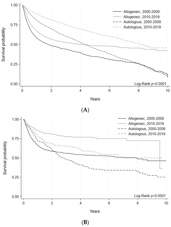 (A) Overall survival of allogeneic and autologous HCT by era in adult patients. Survival probability indicated by year and transplant type for HCTs performed during each time period. Log-rank (p < 0.0001). (B) Overall survival of allogeneic and autologous HCT by era in pediatric patients. Survival probability indicated by year and transplant type for HCTs performed during each time period. Log-rank (p < 0.0001).