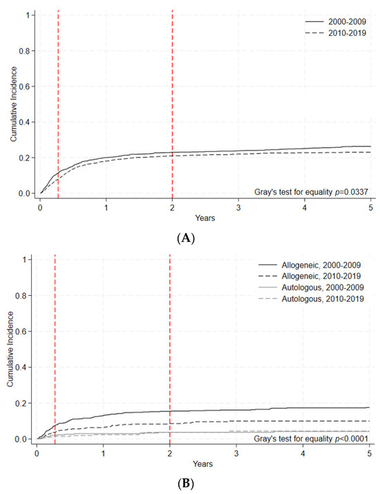 A subgroup analysis of allogeneic HCTs was performed on adults with indications of acute leukemias, myelodysplastic syndromes, and myeloproliferative neoplasms (AML, ALL, AL of ambiguous lineage, and MDS or MPN), excluding chronic myeloid leukemia. Within this subgroup, 5-year OS was stable: 44.8% [95% C.I 42.1–47.5%] in the early era vs. 45.7 [95% C.I. 43.1–48.2%] in the later era, p = 0.1693 (Figure 4A, Table 6A). For these patients, 100-day NRM decreased significantly in the later era (7.85% [95% C.I 6.8–8.9] vs. 11.4% [95% C.I 9.9–13.1], p = 0.0002) (Figure 4B, Table 6B).