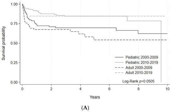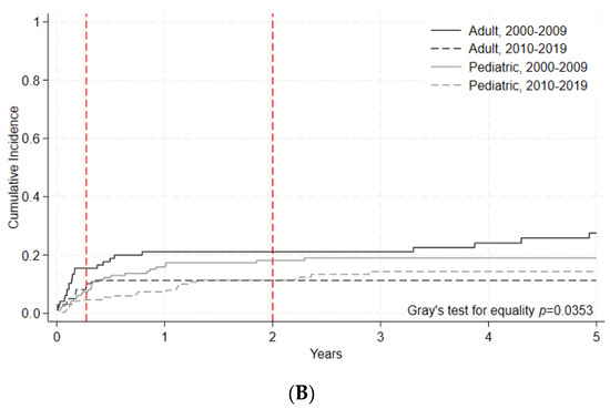 To better evaluate the changes in clinically relevant outcomes, OS and NRM were separately assessed for non-malignant and select malignant disease indications. For non-malignant disease indications, 5-year OS was numerically improved in the later era for adult patients (85% [95% C.I. 75–90%] vs. 70% [95% C.I. 59–79%], p = 0.1529) with a statistically significant improvement for pediatric patients (85% [5% C.I. 78–89%] vs. 78% [95% C.I. 70–84%], p = 0.0393) (Figure 3A, Table 5A). 100-day NRM for non-malignant diseases decreased numerically in the later era for adult patients (p = 0.1686). For pediatric patients, 100-day NRM similarly showed a downward trend (p = 0.2425) between the early and later eras (Figure 3B, Table 5B).