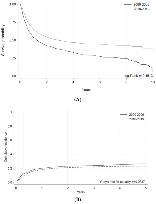 The rise in both allogeneic and autologous HCT among older adults in the later era is consistent with trends in other jurisdictions [10] and poses unique challenges. While older adults may benefit from allogeneic HCT with appropriate selection [14], they experience inferior outcomes in OS and NRM compared to younger adults [15]. This is due to the associated increased incidence of frailty, medical comorbidities, and inherently more treatment-resistant hematological diseases in older adults [16,17]. We observed a 5-fold increase in allogeneic HCT among older adults during the later era, which potentially impacted OS in these patients. However, there was a measurable reduction in 100-day NRM in allogeneic HCT patients treated for acute leukemia and related myeloid malignancies, which attests to temporal improvements in both patient selection and the hospital-based care of transplant recipients, despite their older age. Advances in pre- and post-transplant care, such as reduced-intensity conditioning regimens, more effective graft-vs.-host disease prophylaxis, and the optimal use of antimicrobial agents, also likely contributed to these positive changes [18].