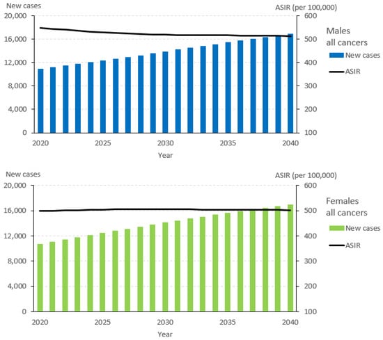 New cases and the age-standardized incidence rate (ASIR) for all cancers, 2020–2040.