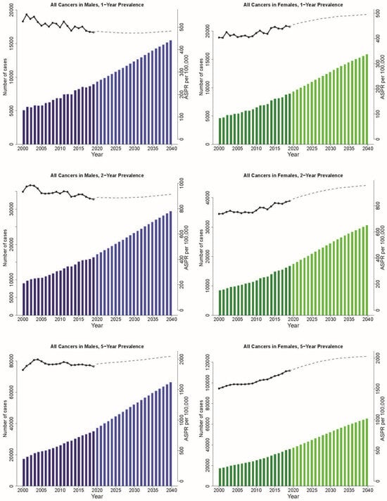The past and projected cancer 1-, 2-, and 5-year prevalence and the age-standardized prevalence rates of all cancers in Alberta, 2000–2040, by sex.