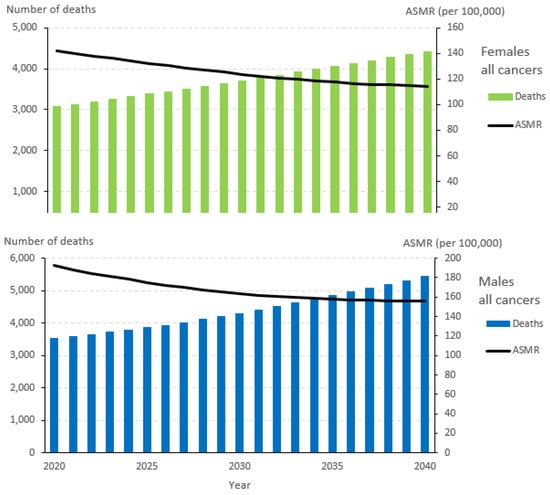 Cancer deaths and age-standardized mortality rates (ASMRs) for all cancers, 2020–2040.