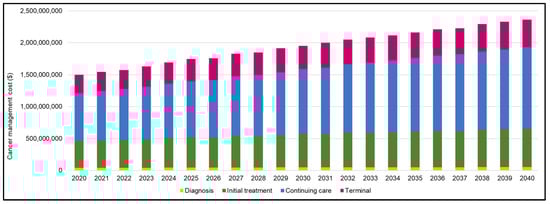 The trends in cancer management costs to the health system are affected by several factors including changes in population size, changes in cancer incidence rates, changes in cancer mortality rates, and changes in treatment modalities and the associated costs. The largest portion of cost—and the largest increase in cost—was related to continuing care, which was estimated at $0.7 B in 2020 and $1.3 B in 2040 (71% increase). Continuing care is associated with the expenses incurred for surveillance and active follow-up care, and its increasing cost can be partially attributable to the projected improved survival rate. In addition to increasing costs to the health system, there is a considerable financial burden for patients and families, which is also increasing []. Future studies should focus on implementing and evaluating models of care that create value and improve health outcomes. The cost of delays in approvals or gaps in therapeutic coverage should be evaluated as a potential source of system and cost improvement. Investment in studies examining cost-effectiveness of approved therapies, and potential cost savings for biosimilar and other off-patent therapies are also required.